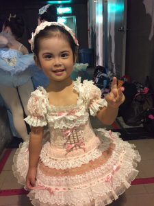 舞台用のメーキャップをして、身体も塗って、ウォームアップまで完了したら、トウシューズやサテンシューズを履いて、衣裳と髪飾りを付け、準備万端に整えて、舞台袖にスタンバイ。皆ドキドキしながら「あと何曲目?この次の次?もうすぐたー!」とテンションマックス!